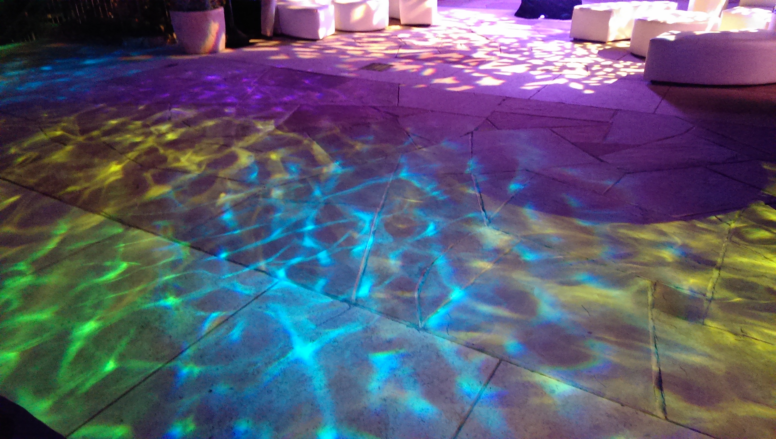 How about some spot lighting during your first dance? Would you like to see your wedding initials in lights with a custom gobo? Perhaps your company logo would look great 40 feet across on the ceiling of your event tent. Or perhaps a classy water image light during slow dances? Water image lights are a special dynamic gobo projector light (see example below).